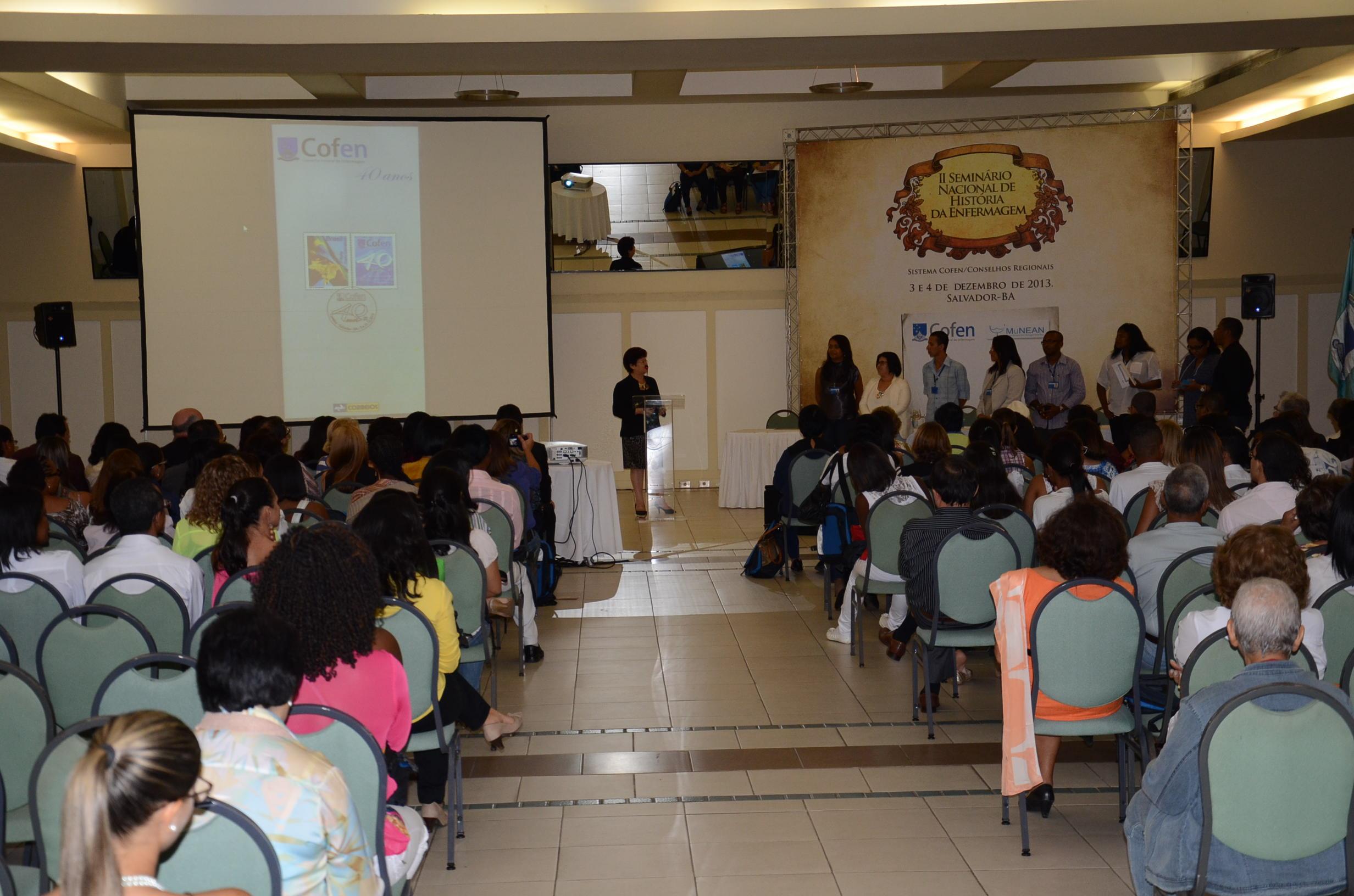 Cidade berço de tantas conquistas e descobrimentos históricos, Salvador é a sede do II Seminário Nacional de História da Enfermagem que ocorre nos dias 3 e 4 de dezembro, no Hotel Pestana da capital baiana. Com a ideia de dar continuidade a série histórica do seminário, este ano os participantes assistem a palestras de estudiosos e mestres da Enfermagem, recontando importantes temas históricos da profissão. A mesa de abertura do Seminário foi composta pelos seguintes membros: presidente do Cofen, Osvaldo Albuquerque, conselheira Fátima Sampaio, presidente do MuNEAN, Maria Júlia Lemos, presidente do Coren-BA, Maria Luísa de Castro Almeida, coordenador regional dos Correios na Bahia, Miguel Martinho dos Santos Júnior e a representante da Federação Nacional dos Enfermeiros, Fabiana Santos.