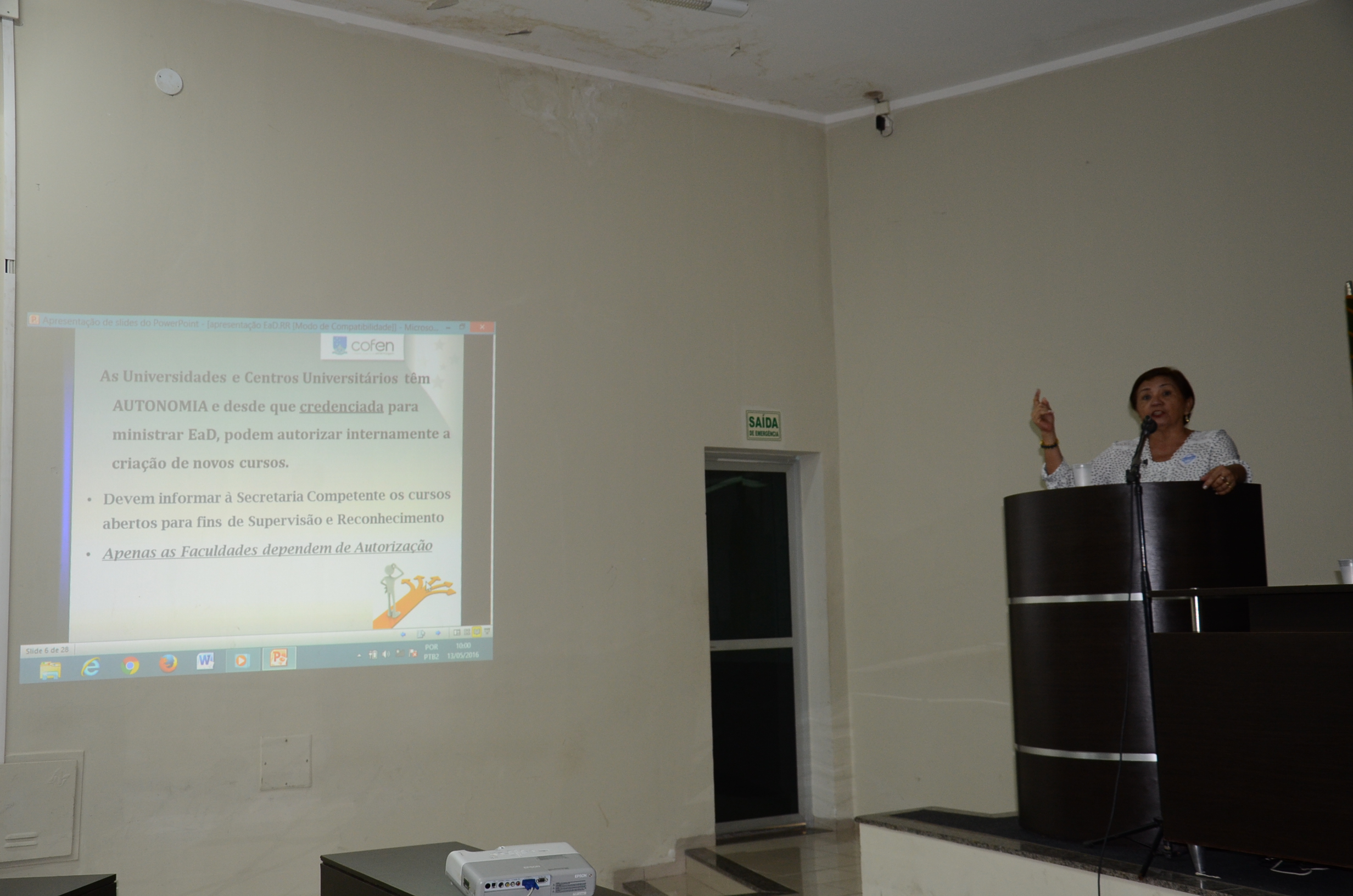 A coordenadora da Câmara Técnica de Ensino e Pesquisa do Conselho Federal de Enfermagem (CTEP/Cofen), Valdelize Pinheiro, apresentou a realidade do ensino a distância descoberta in loco, com instituições funcionando irregularmente e situações precárias pelo Brasil.