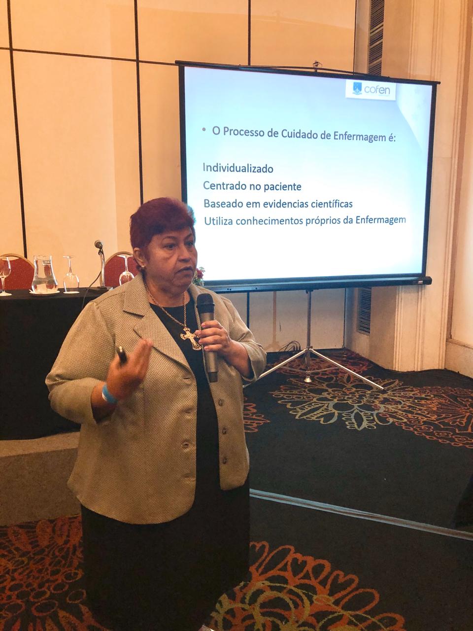 A enfermeira Fátima Sampaio, colaboradora do Cofen, abordou em sua palestra o processo de cuidado e os desafios da profissão na região. “A Enfermagem é a ciência do cuidado, portanto os profissionais devem basear o cuidado em evidencias científicas, e usar uma metodologia assistencial baseada no conhecimento próprio da enfermagem”, enfatizou. Fátima também representou o Cofen na reunião de presidentes das Associações Nacionais de Enfermagem, conduzida pela presidente do ICN, Annete Kennedy, que aconteceu nesta terça-feira (15), em Montevidéu.