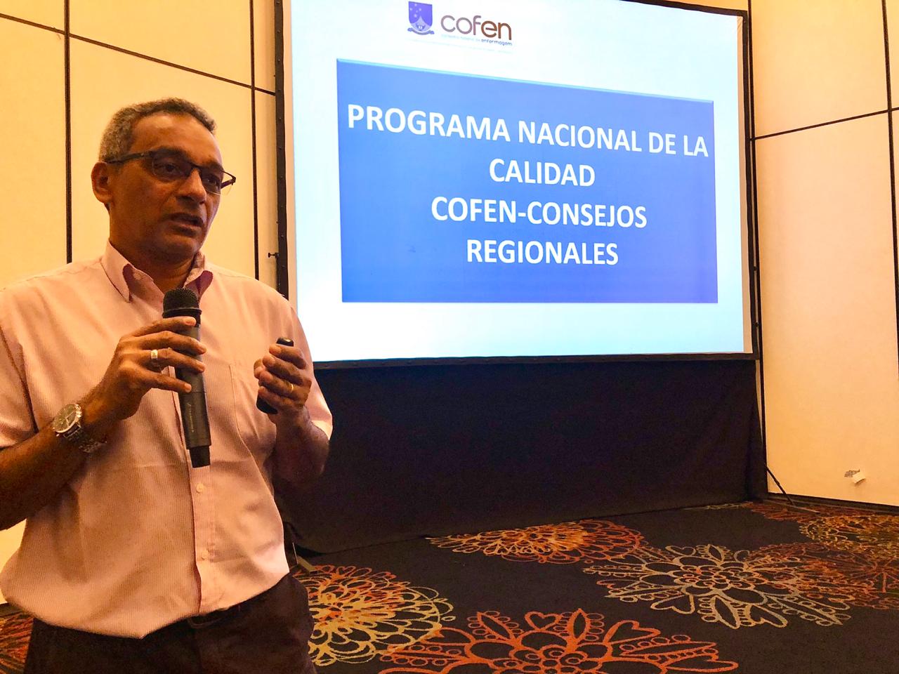 O chefe do Departamento de Gestão do Exercício Profissional do Cofen, Walkírio Almeida, apresentou o programa de certificação da qualidade do Cofen (PNQ) e sua importância para o processo de cuidar. Segundo Walkirio, 14 instituições de saúde receberam o selo da qualidade no Brasil em 2019 e 5.492 profissionais de Enfermagem foram certificados neste primeiro ano de execução do programa. “O PNQ busca melhorar as condições de trabalho e reconhecer as boas práticas dos profissionais para a segurança do paciente”, destacou.