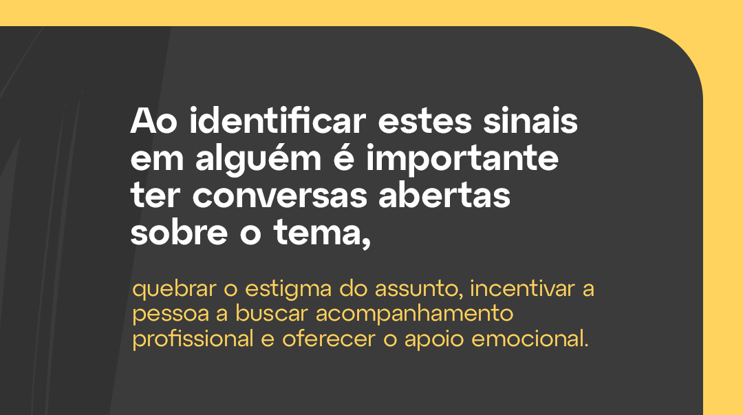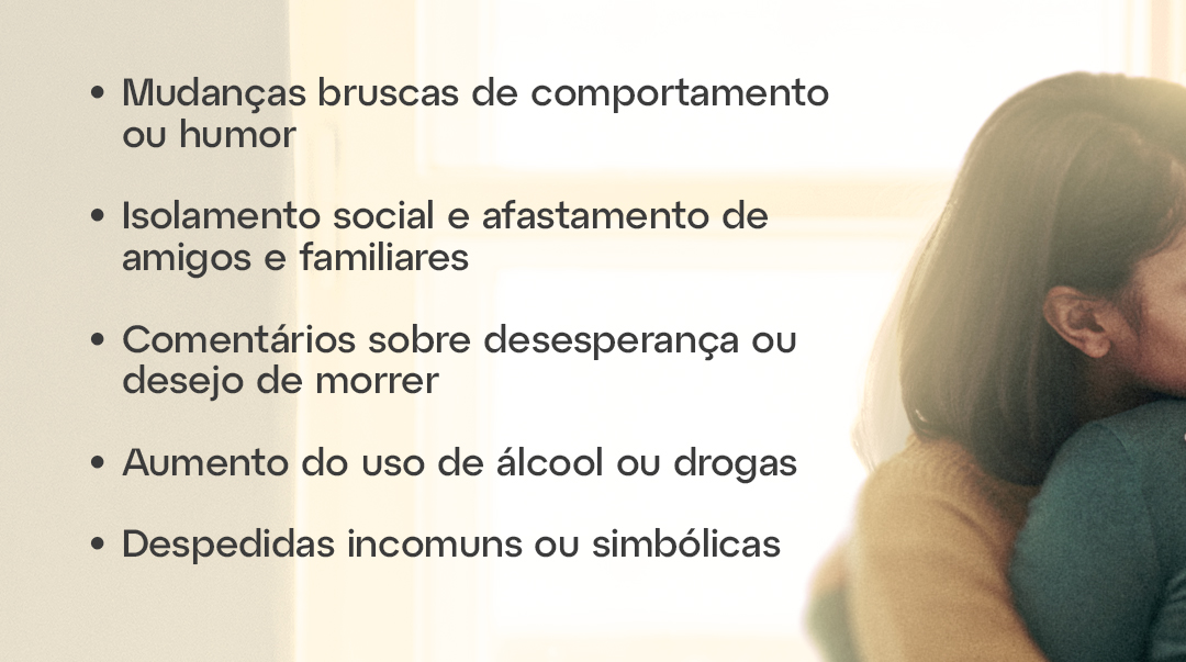 Fatores de alerta que merecem atenção: Isolamento afetivo e sentimento de solidão; Mudanças marcantes de hábitos; Perda de interesse por atividades antes prazerosas; Descuido com a aparência; Piora do desempenho na escola ou trabalho; Alterações no sono e apetite; Fatores de alerta que merecem atenção: Irritação ou agitação excessiva; Tentativas prévias de suicídio; Histórico familiar de suicídio; Sentimento de desemparo e desesperança