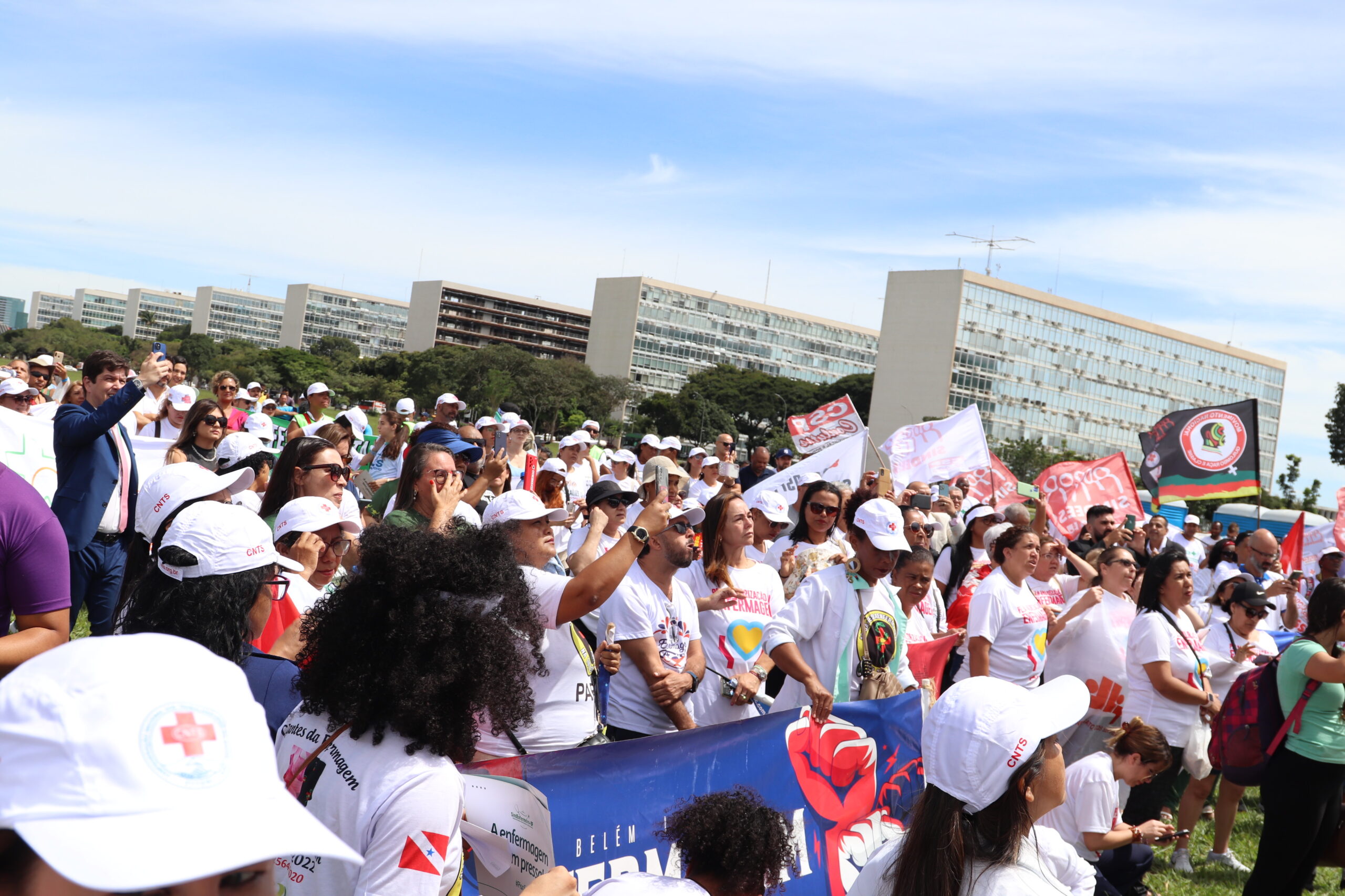 A manifestação organizada pelas entidades que compõem o Fórum Nacional da Enfermagem (Aben, Cofen, CNTS, CNTSS, FNE, Anaten e Eneenf), ocorreu na Alameda dos Estados, frente ao Congresso Nacional, como forma de demonstrar a urgência em decidir de forma definitiva os impasses frente à Lei 14.434/2022, que assegura o piso salarial da Enfermagem.